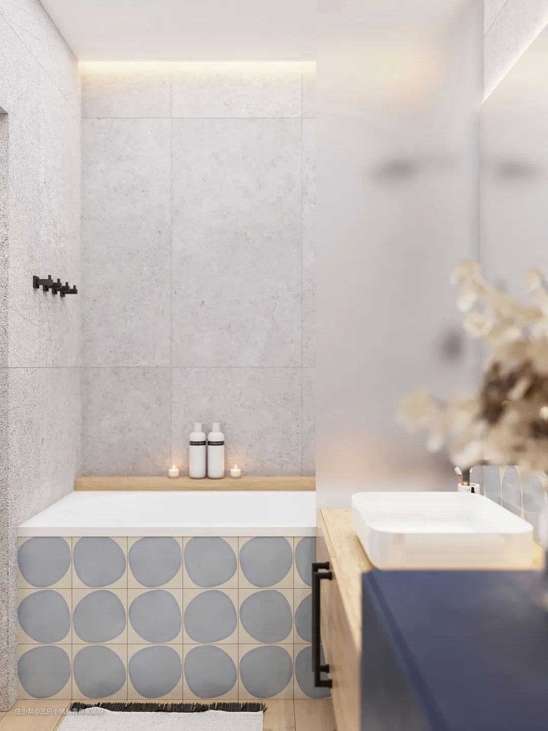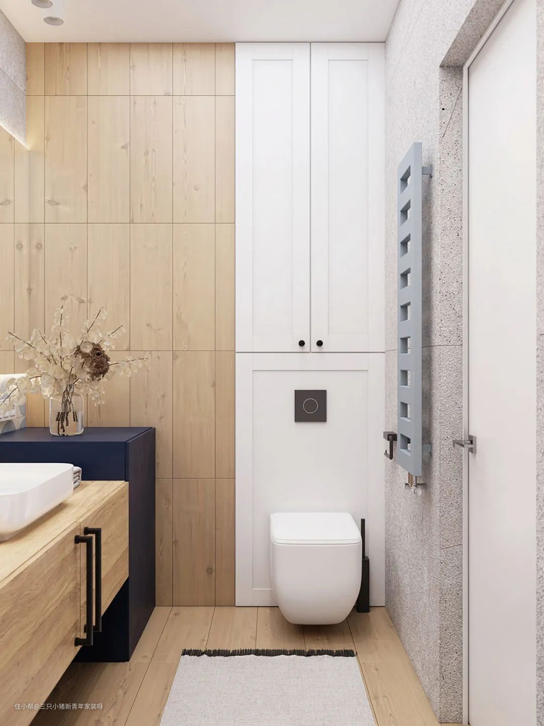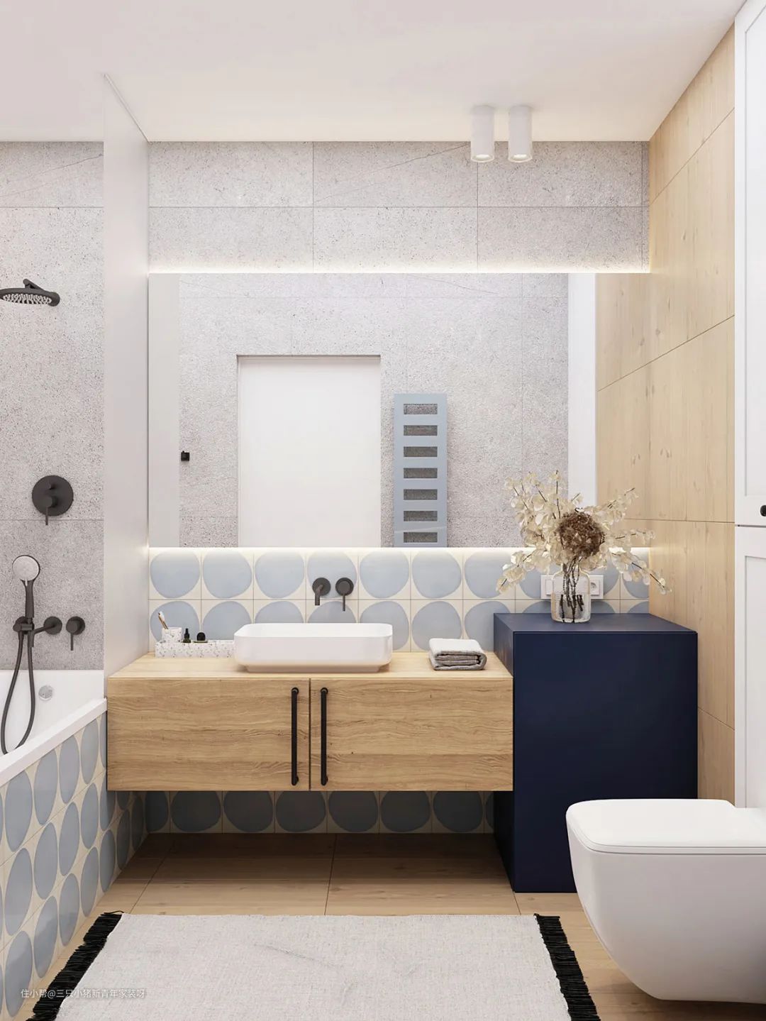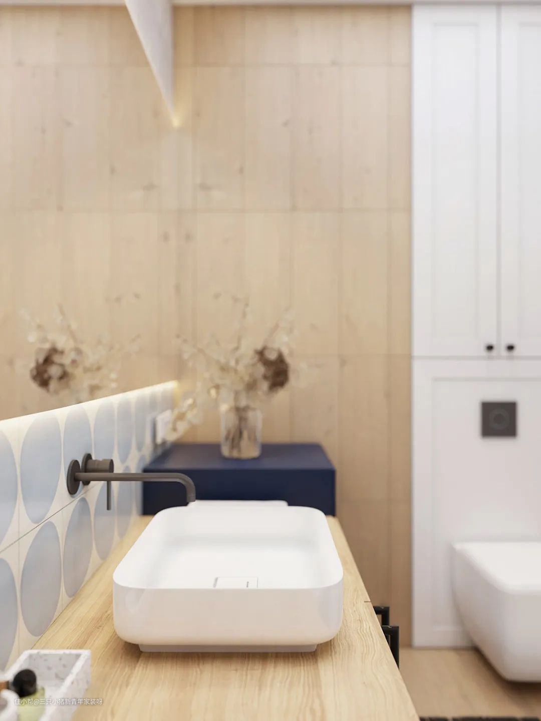 卫生间依旧延续蓝色调,搭配温暖的原木色,增加了浴室与家的整体感。