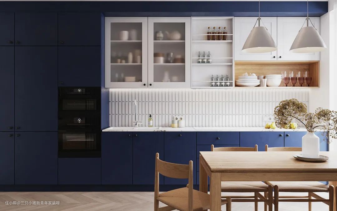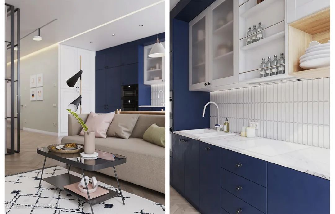 厨房是整个房间内最亮眼的风景线,克莱因蓝搭配白色墙面和白色瓷砖的点缀,颜色鲜明对比。橱柜在自然光线的反射下视觉上建立了一种错觉感。