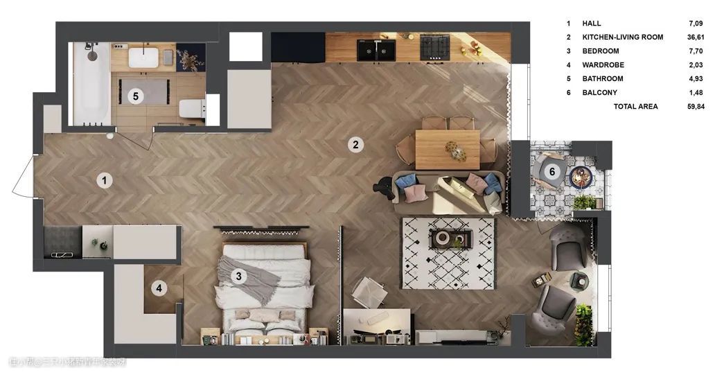 在灰色基调下彩色和木质色调方案丰富整个空间。