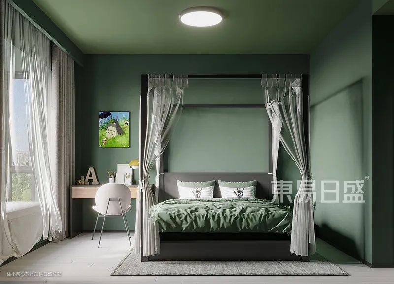 女孩房被墨绿包围,四柱公主床增添丝丝温馨感,龙猫挂画是孩子最喜欢的角色,置身于此仿佛森林里的精灵,畅游于童话世界。