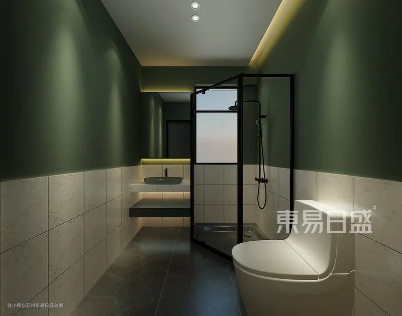 暗色哑光瓷砖搭墨绿色墙面,线性点灯装饰,高级感满满,干湿分离区域更加整洁。