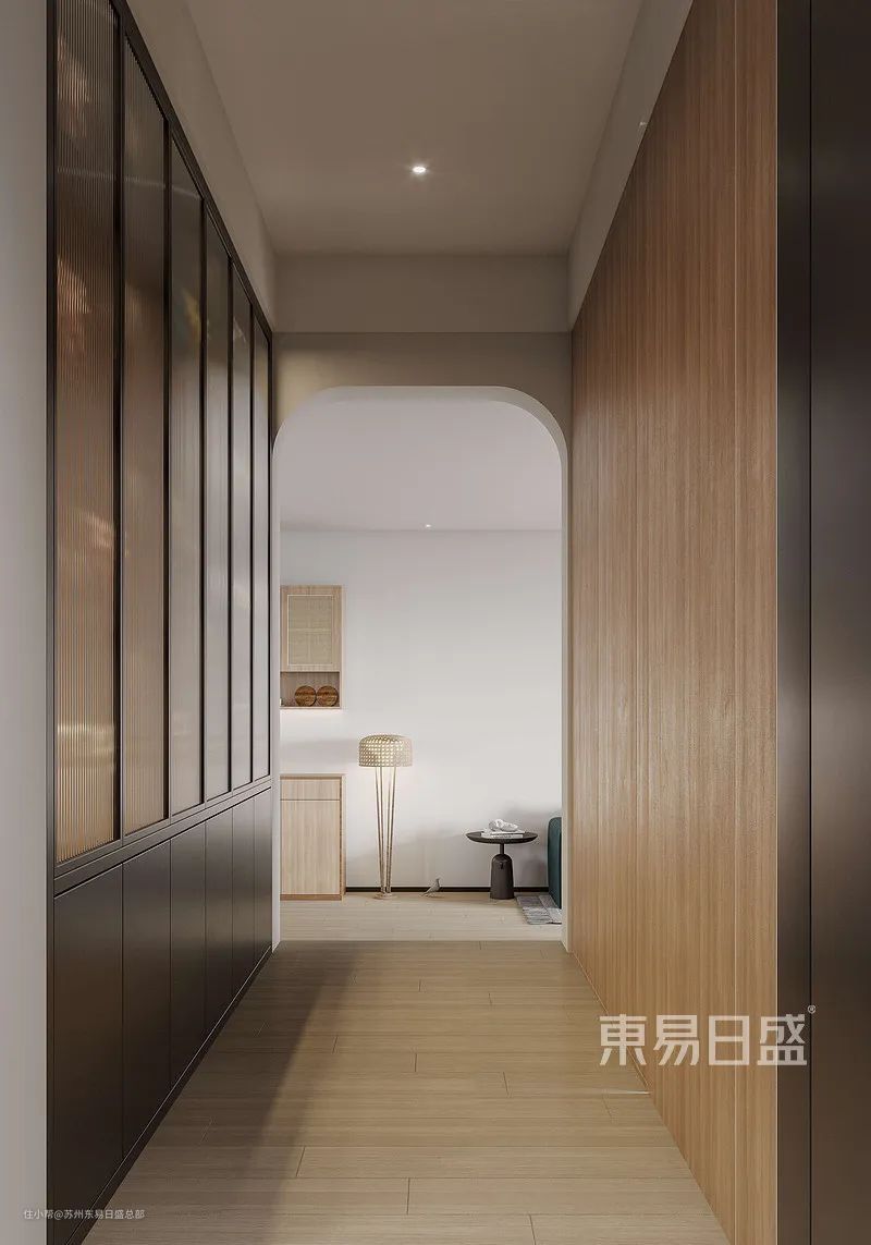 原木色玄关柜圆形拱门,空间棱角感被柔化的同时保留水平方向线条,原木色系不过分沉闷,加之灯光点缀空间精致复古。