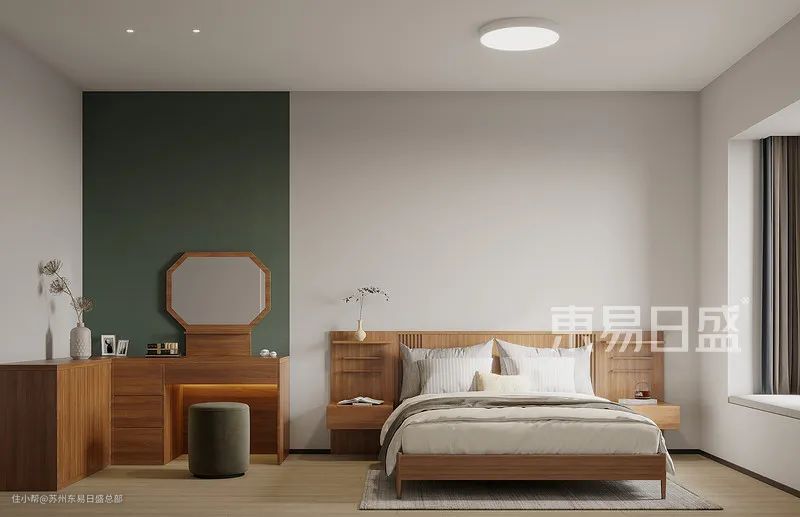 墨绿色墙饰半墙出现,空间蒙上一抹复古,温润清新原木色装饰梳妆台,清晰自然满满舒适感。