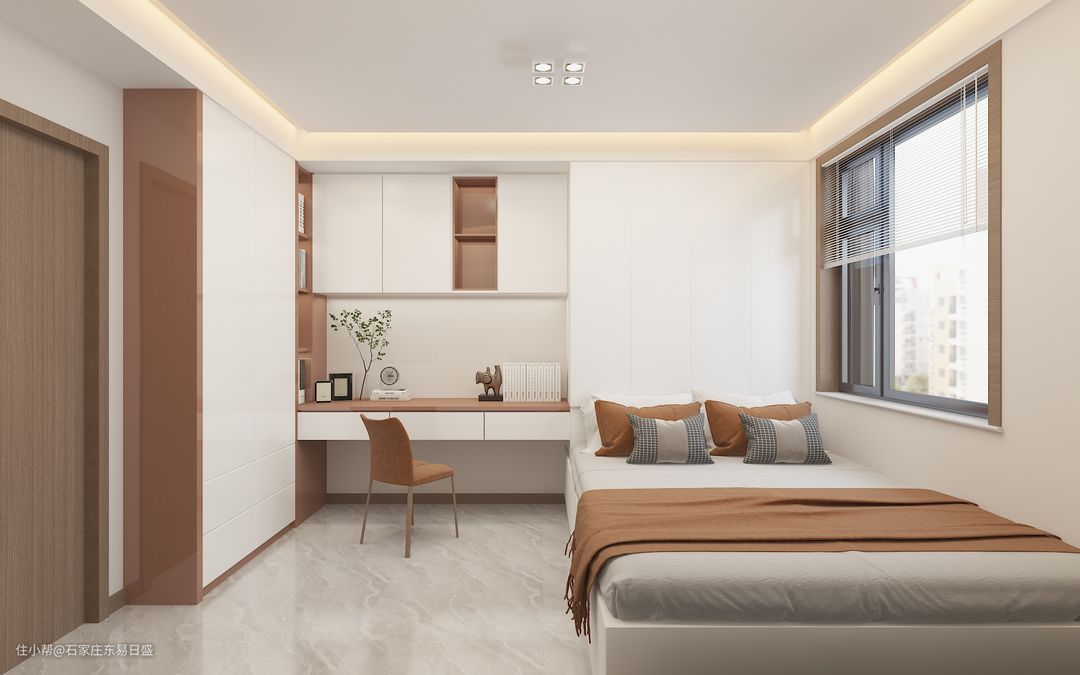女儿房以榻榻米的形式来体现的。书桌与书柜及衣柜相结合。以橘色和白色调为主。