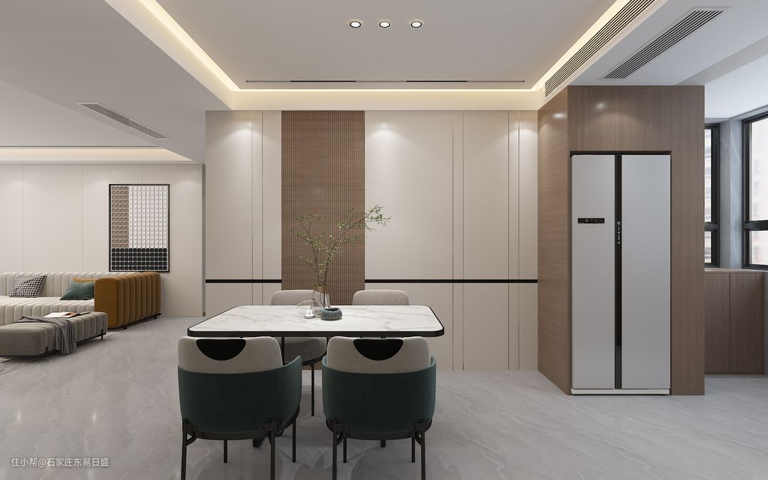 餐厅也延续了客厅的整体风格,顶面是无主灯形式,吊平顶与灯槽相结合。