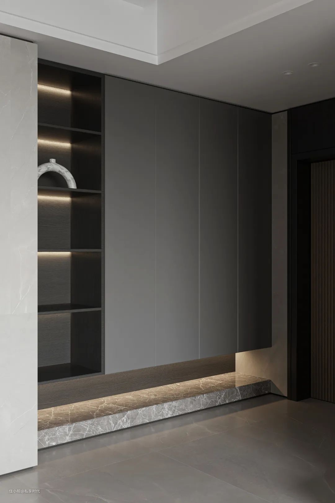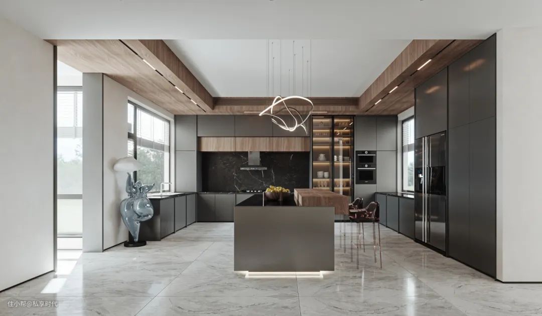 莫兰迪色是克制的美学,肤感板材与木色两种材质相互配合,在空间里施展潮流的奢意,木色中和了原本空间的艳丽与厚重,寻得一种宁静而高贵的艺术平衡。
