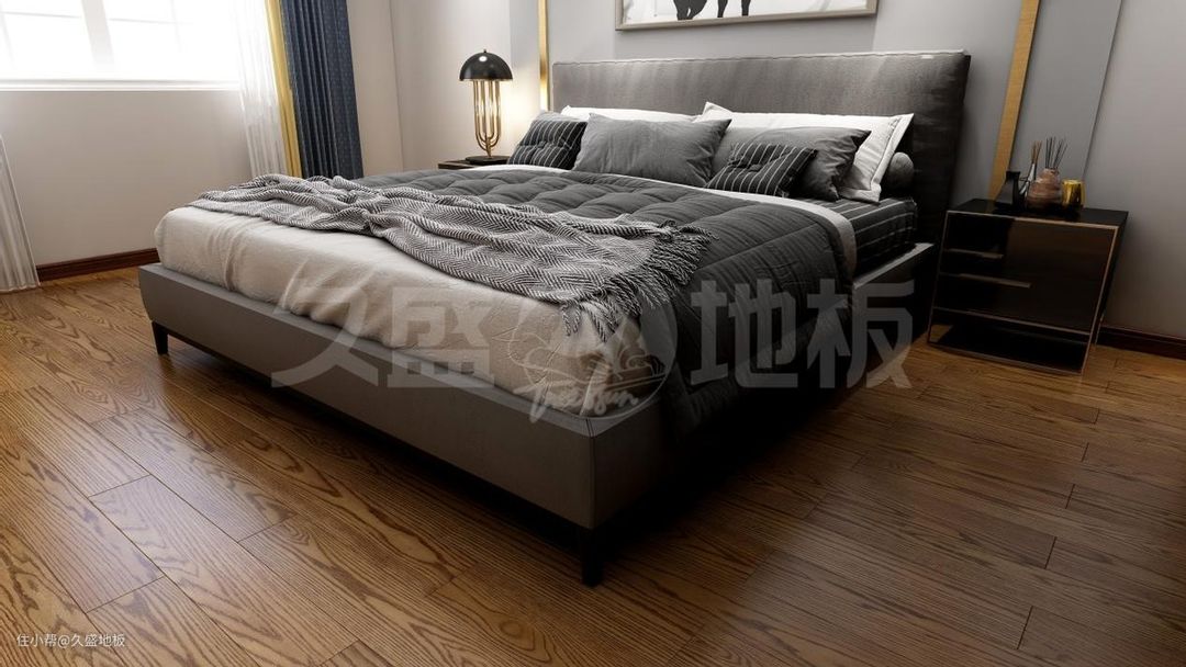 深色的现代简约风装修有着与众不同的冷静气质,深色调的配色凸显空间的静谧感,若是担心空间整体过于冷淡,可以选择久盛极简风胡桃色地板。