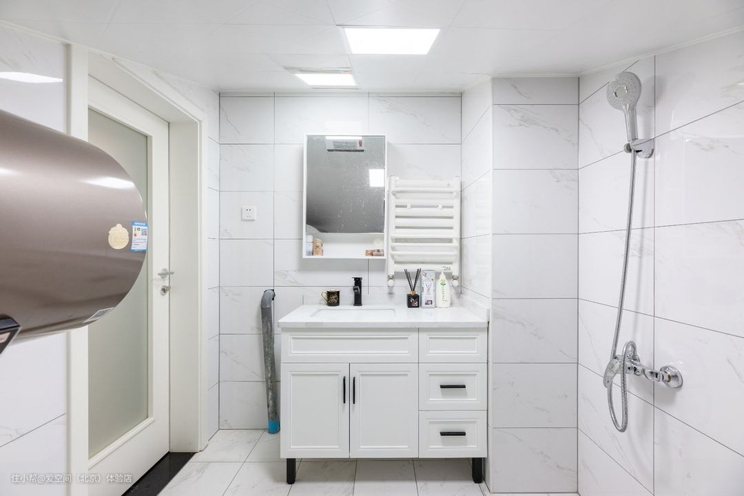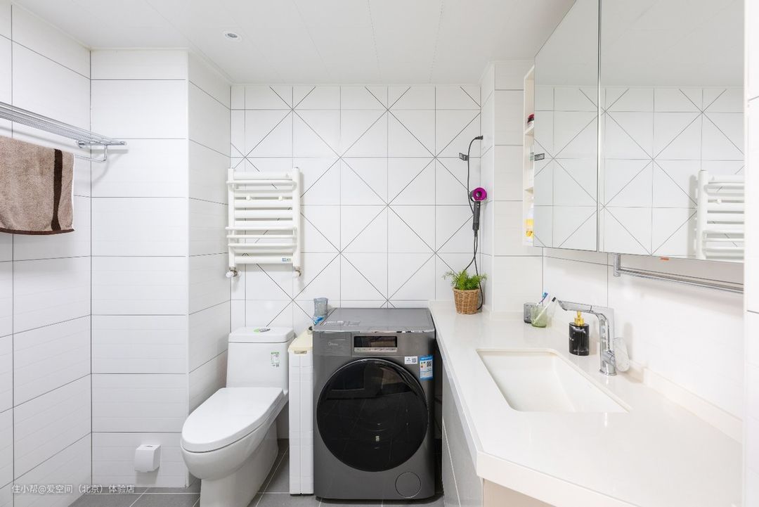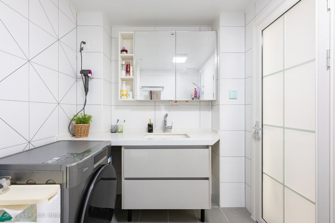 洗衣机放在了浴室柜旁边,卫生间拥有完善的进水和排水系统,能够充分满足洗衣机用水需求,无需另外考虑排水问题,放在这里非常合适。