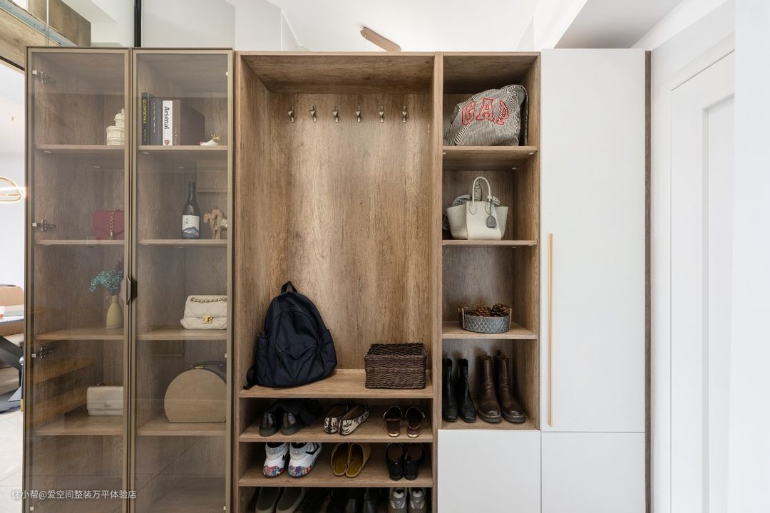 为了减少狭长型玄关带来的压抑感,所以玄关柜柜门采用了玻璃和开放格,开放格可以放随身用品,比如钥匙、口罩等,避免乱放找不到,玻璃柜门放一些收藏品,比如包包一类的物品。