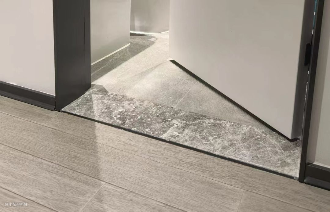 比如说,客厅到卫生间,虽然用的是同色同材质的瓷砖,在安装过门石后,明显被划分成两个不同的区域。