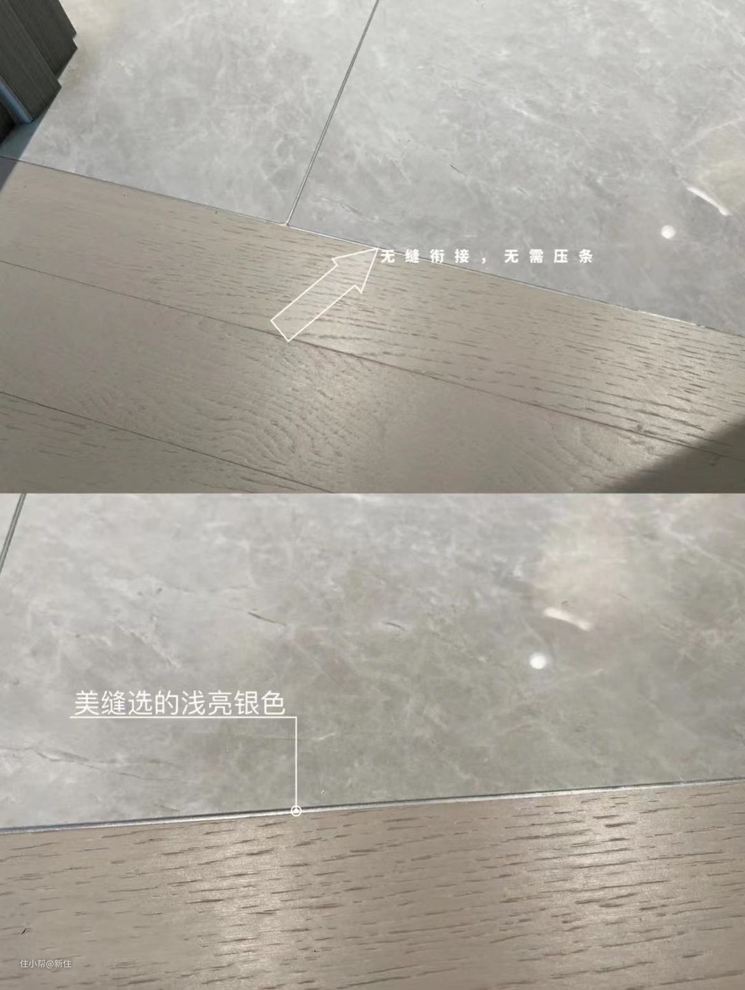 但这类型师傅,属于可遇不可求系列,更多家庭对不同材质之间的拼接是用压条方案,施工相对简单,效果也还不错。