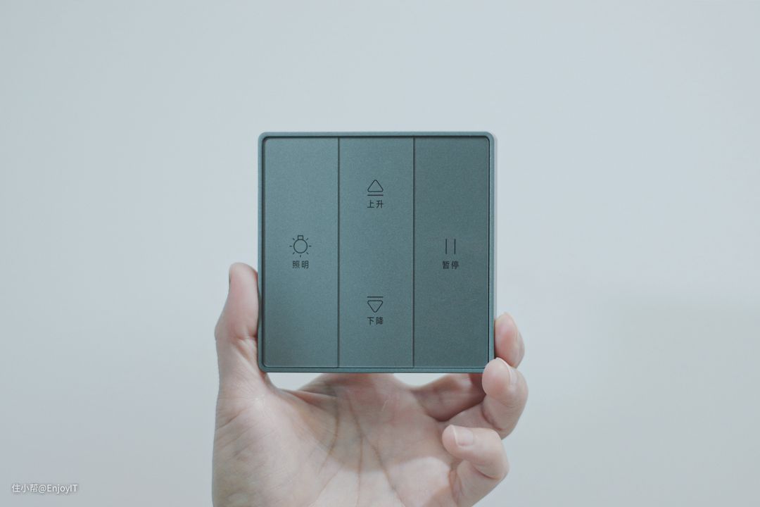 这无线遥控器最方便的是不用接线,底座可以直接粘在墙壁,放在墙插边上。和晾衣机同为极地灰配色,整体颜值倒是大气简约的。按键功能方面和我原先的一样,照明、上升、下降、暂停,这四个操作。按压的键程段落如果能再强化明确一些就更好了。