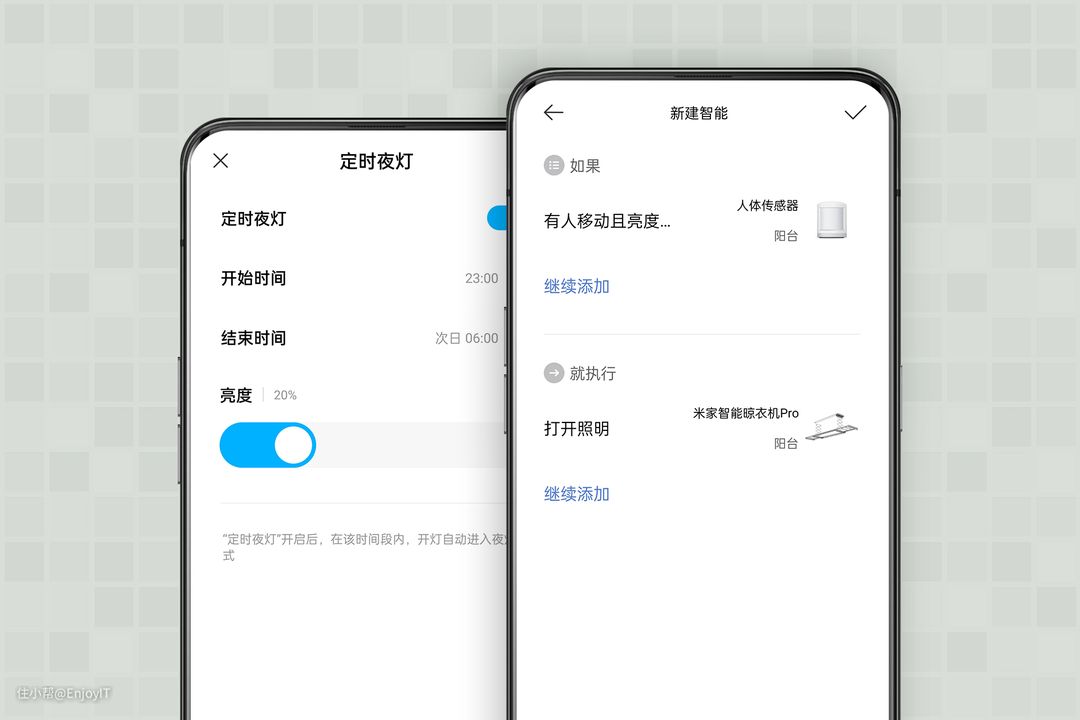 虽然APP自带的定时夜灯功能很贴心,但我希望它更智能一些,并且通过米家特色的联动功能,也的确能做到,只需要通过人体传感器,你就能在夜间实现过去自动打开照明功能,以及离开自动关闭照明,做到更便捷的使用体验。