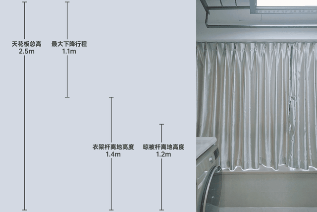 为了给大家一个直观参考,我做了一个参照对比,我的天花板总高约2.5m,它的最大下降行程为1.1m,也就是降到最低时候,上面衣架离地高度约1.4m,展开的晾被杆离地高度约1.2m。这个高度,即便是小身形的朋友都能轻松晾晒衣服被子等。
