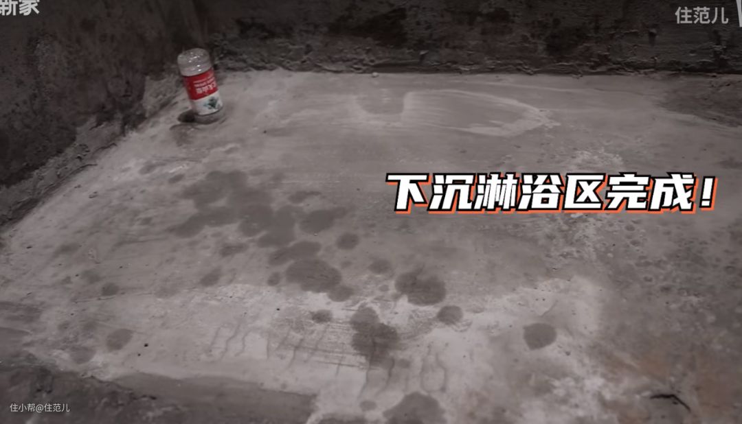 为了消除绊脚的挡水石,他给淋浴区做了整体下沉,然后给到一个完整的大坡度到地漏。
