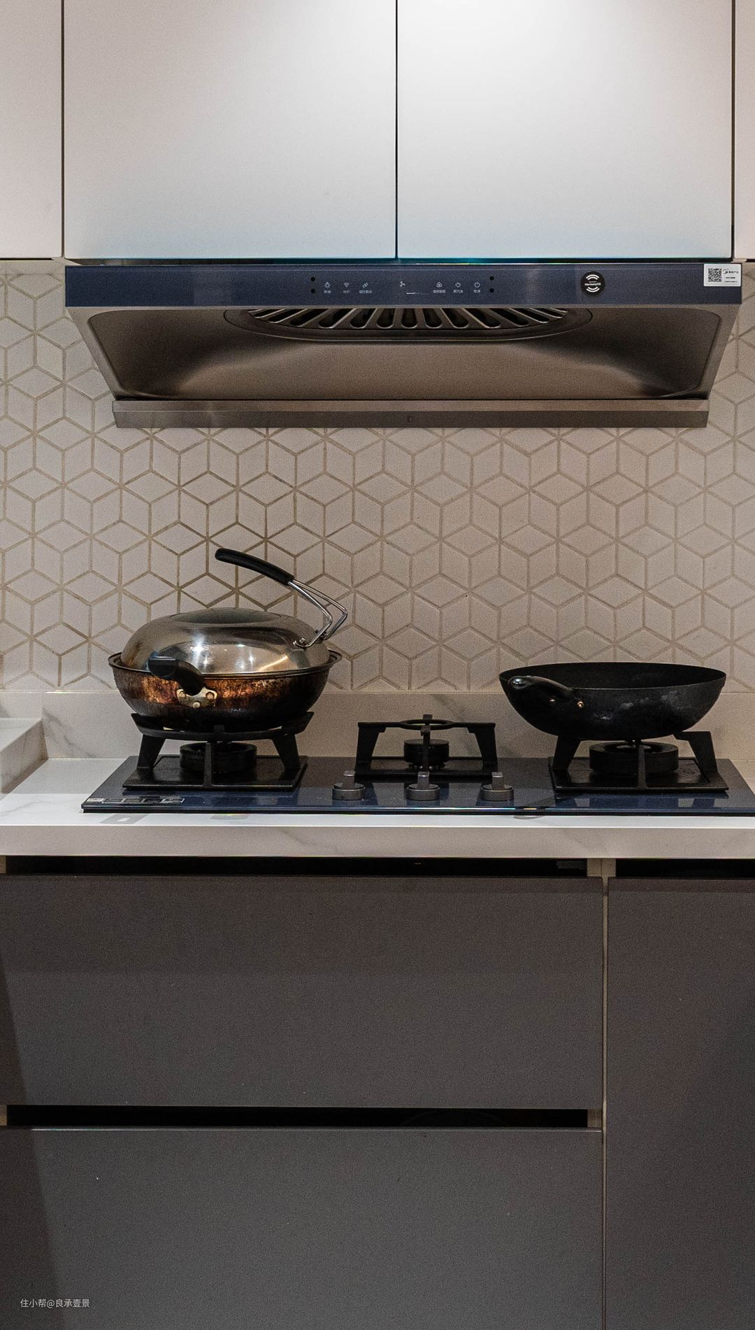 藉由吧台与高柜化为界线,捨弃门片构筑,使U字型烹饪区更显敞亮,并由纯白色铺陈电器柜,在煮饭的燃气灶台上侧与上方都布满收纳柜,达到完善性能。