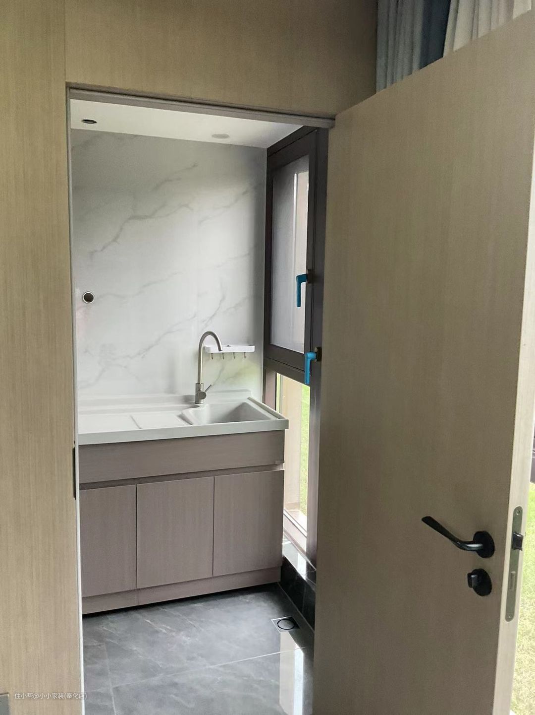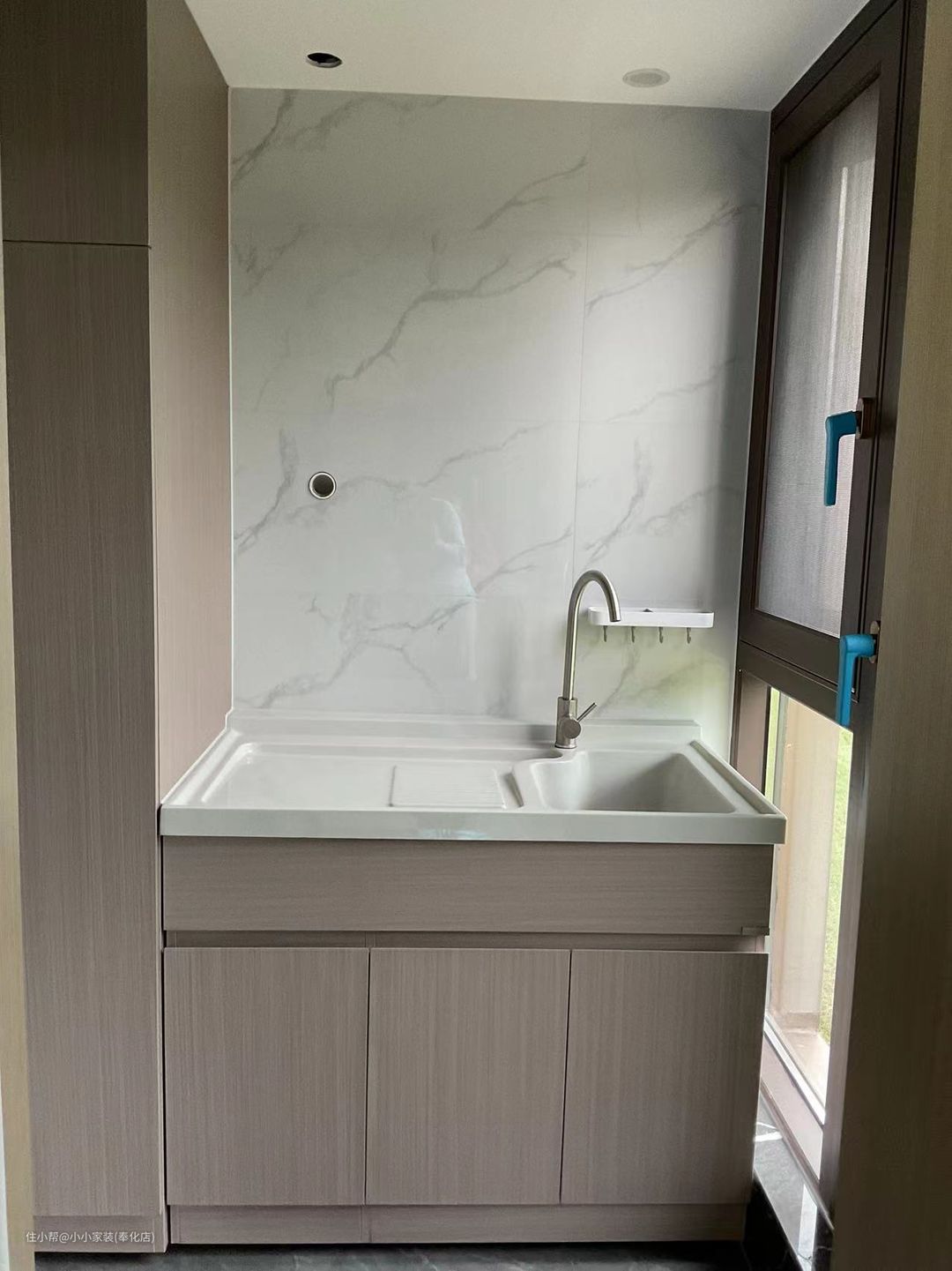 #阳台洗手台丨一体式隐形门,让空间更加整体小小家装(奉化店)2022-10-11因为本户型有一个角落阳台,阳台与客厅相连的区域做成了落地窗,而剩下的一个小角落选择做成了洗手台,为了保持客厅的整体性,我们选择了做隐形门,把这个阳台藏在木板里。