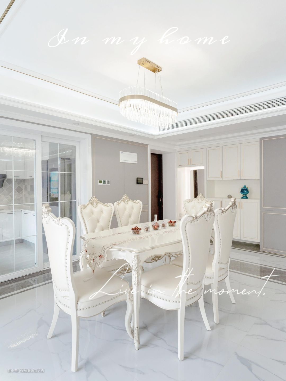 餐厅也是统一色系金属雕花的白色皮质餐椅