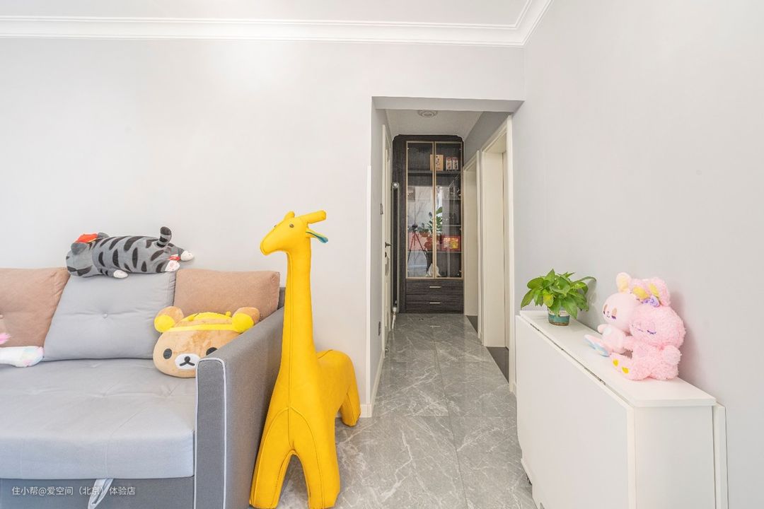 在过道的尽头做一组通顶收纳柜,柜门采用玻璃柜门,不会在视觉上产生压抑感,同时也可以当展示柜使用,放一些收藏的物品。