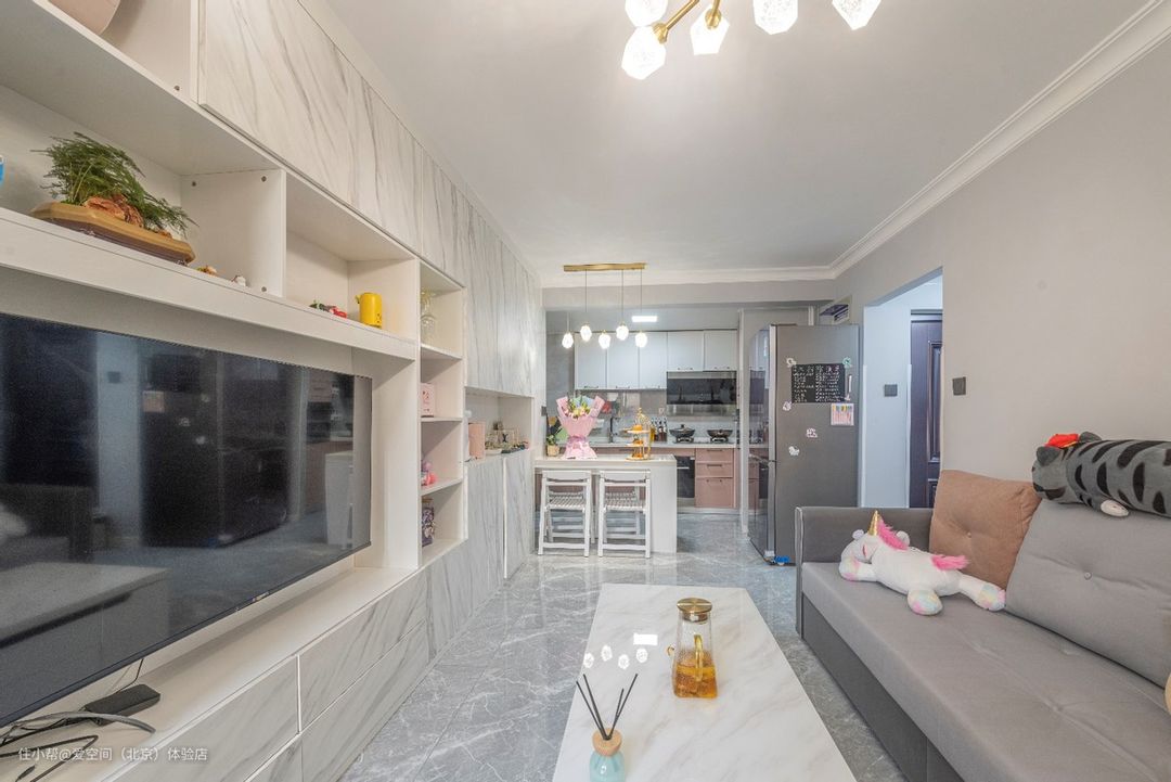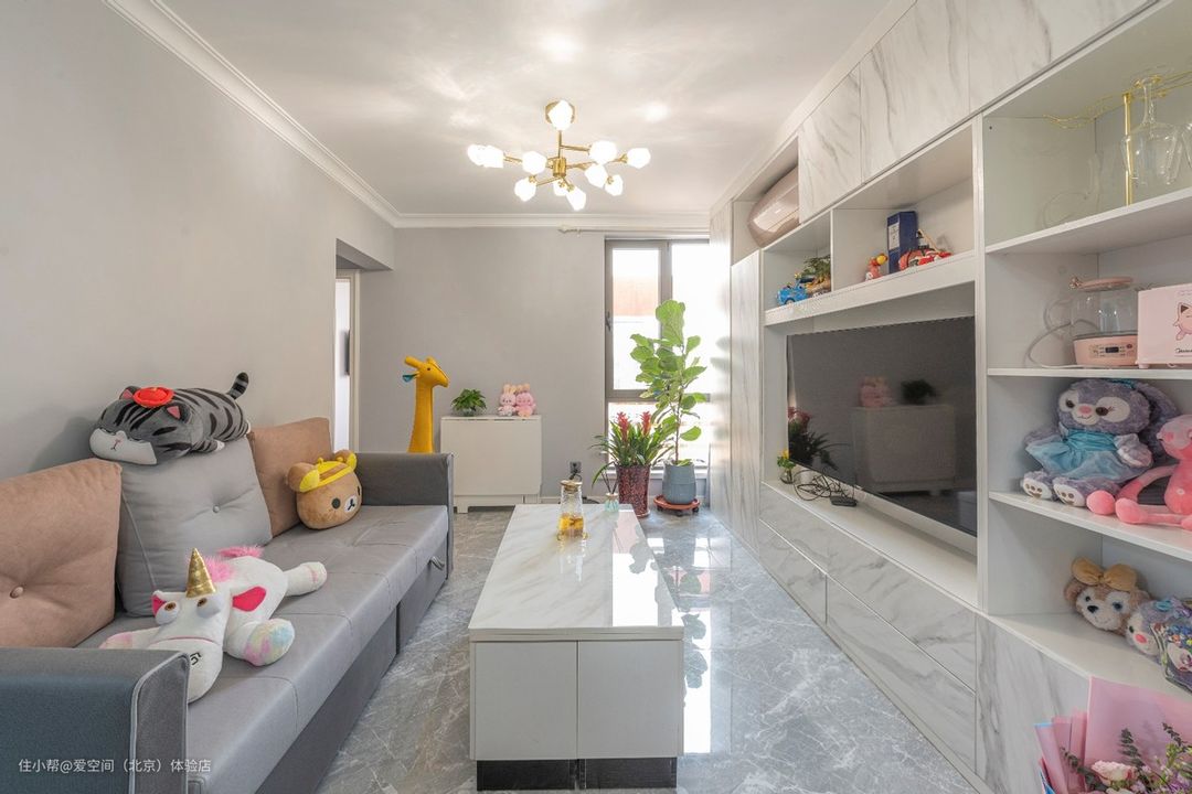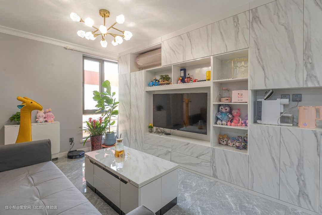 满墙电视柜拥有超强的收纳能力,可以把整个客厅乱七八糟的东西都收纳进去,客厅瞬间干净整洁,藏露结合,有藏有露的合理分配,增加柜体的收纳和展示的空间,同时也让整体布局对称而不呆板。