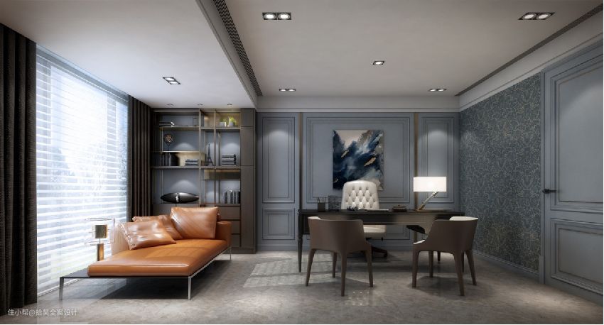 二楼男主书房是灵感和激情的所在,双人办公桌方便使用,适度的装饰使家居不缺乏时代气息,使人在在空间得到精神和身体的放松,并紧跟着时尚的步伐,从而达到业主需求也不缺乏设计之感。