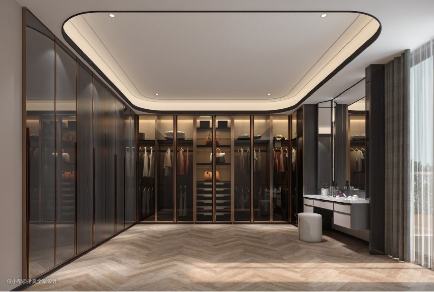 主卧衣帽间有着内敛却强烈的表达欲望,仿佛间接向主人传达“自信即是美的阔达,礼赞生活格调,于一丝静谧恬淡中感受简洁外表下的精致。