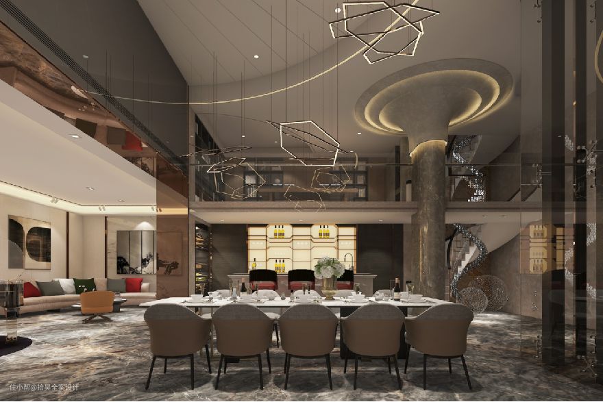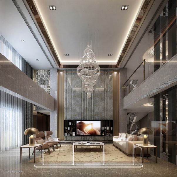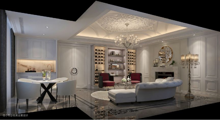 一楼客厅布置在整个家居空间中处于领导地位,其设计色调和风格体现了户主的品味与喜好。 客餐厅所占面积比较大,所以在设计过程中,我们使用奢华的水晶吊灯与家具摆放的平面错落感来“填充”这个大空间,让客厅布局具备结构感的同时又不空荡荡。