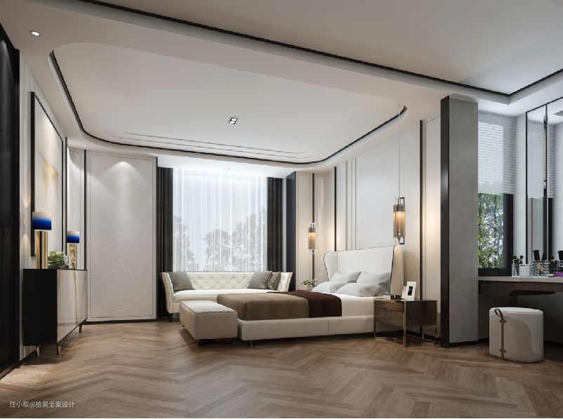 五楼主卧的设计,设计师希望与以往的设计风格有所不同,所以在床的选择上,订制了比较夸张的床靠背,它能很好的拉升空间比例让休息睡眠区显得更加大气,同时又能很好的融入到护墙背景中,使整个背景整体性更强,这样的设计手法可以让原本不是太大的空间显得更有张力。