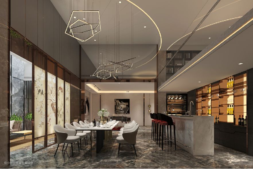 一楼餐厅依照屋主的生活习惯细致地划分与组合,它们形散神聚,互相独立又互相依赖;作为餐厅空间的主背景,经室外光线的影射下,衬出材质的自然肌理,在岩板的温润细致与金属的刚硬交织之下,勾勒出空间的独特气质。