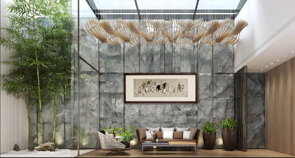 天井区作为负一楼唯一的采光区在设计过程中,墙面采用浅灰色的石材装饰,旁边用竹子做装饰,当你在午后与小友惬意品茶的时候,能闻到的除了茶叶里的新竹气息还有空气中弥漫的清香;竹以自身优美的姿态,可作为空间中的视觉焦点,使得空间显得和谐而有生气。