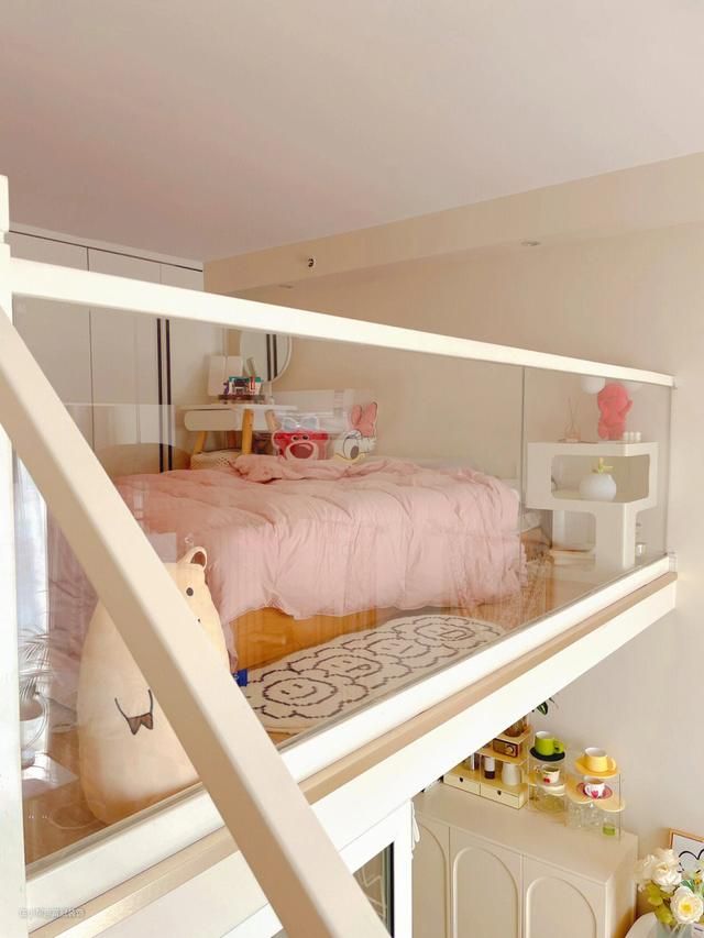 从楼梯上去就是卧室了,玻璃扶手很通透,也能享受到落地窗外的阳光。
