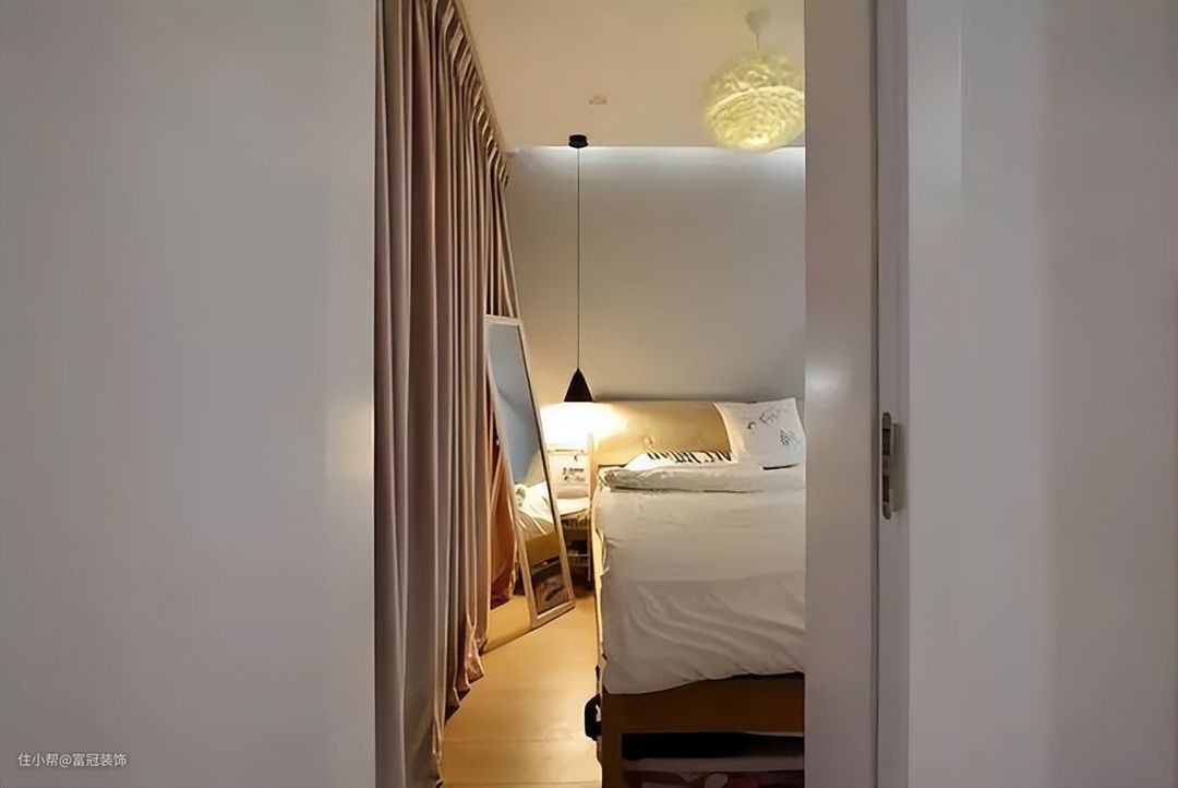 主卧室可以通过改变门的位置挤出衣帽间,并使用窗帘作为隔断,以节省资金和空间。