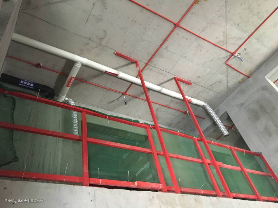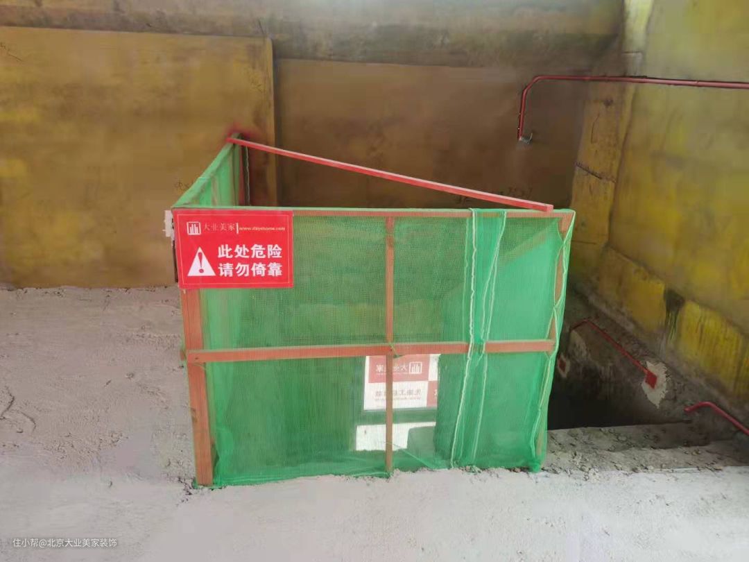 室内挑空部位必须设立防护栏,使用钢管或者木方对镂空部位进行防护,并且统一粉刷成大业红,防护栏高度不得低于1100mm,固定要牢固可靠。