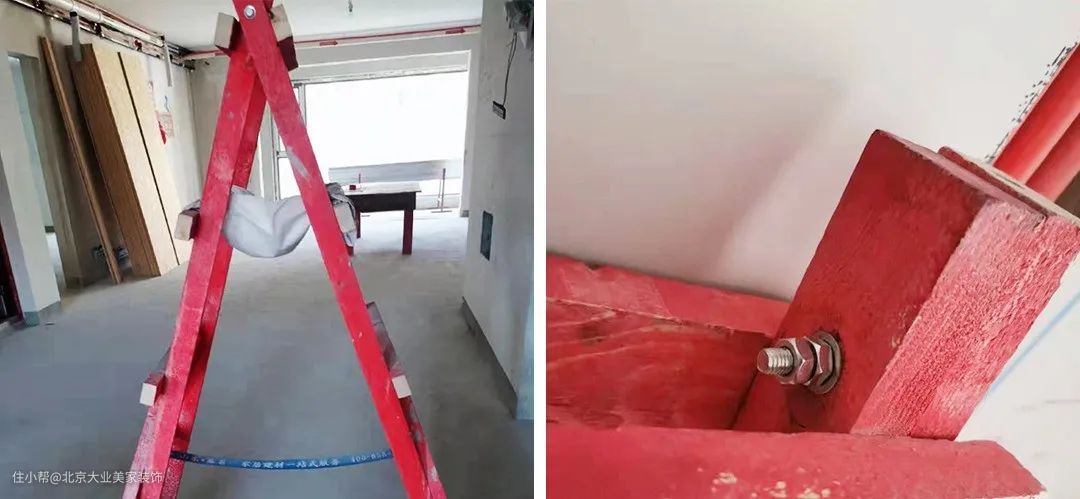 现场使用人字梯必须保证人字梯腿部有安全绳进行双面固定,防止人字梯开合过大导致人员坠落。人字梯顶端必须使用螺丝螺母进行固定,禁止使用铁钉及丝杆固定,防止固定点脱落造成人字梯失衡,人员坠落。