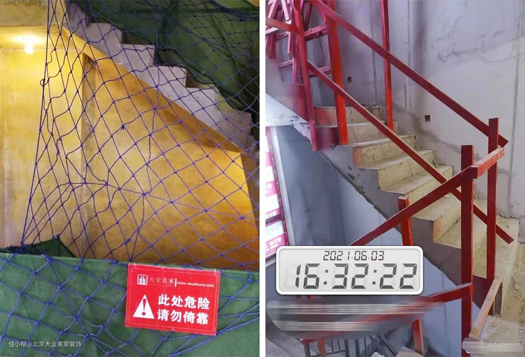 楼梯踏步外侧必须使用钢管或木方进行安全防护,防护必须坚固可靠,高度不得低于1100mm,统一粉刷企业色,楼梯悬空部位挂安全网,防止人员或物品坠落造成人员受伤。