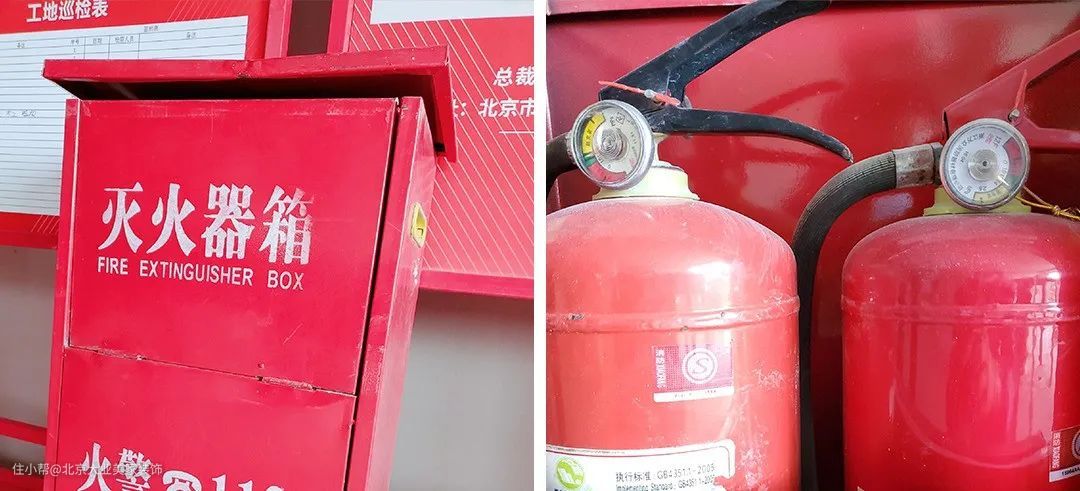 平层工地放置灭火器不低于两个,别墅供地每层放置灭火器不低于两个,灭火器放置于灭火器箱内,放置于室内明显部位。保证灭火器处于压力表指针在绿色范围内,处于压力合格状态。