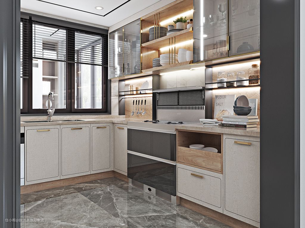时代广场系列整体橱柜,极简门型、半透明高级灰玻璃、以及层板灯光等多元素的灵活运用。