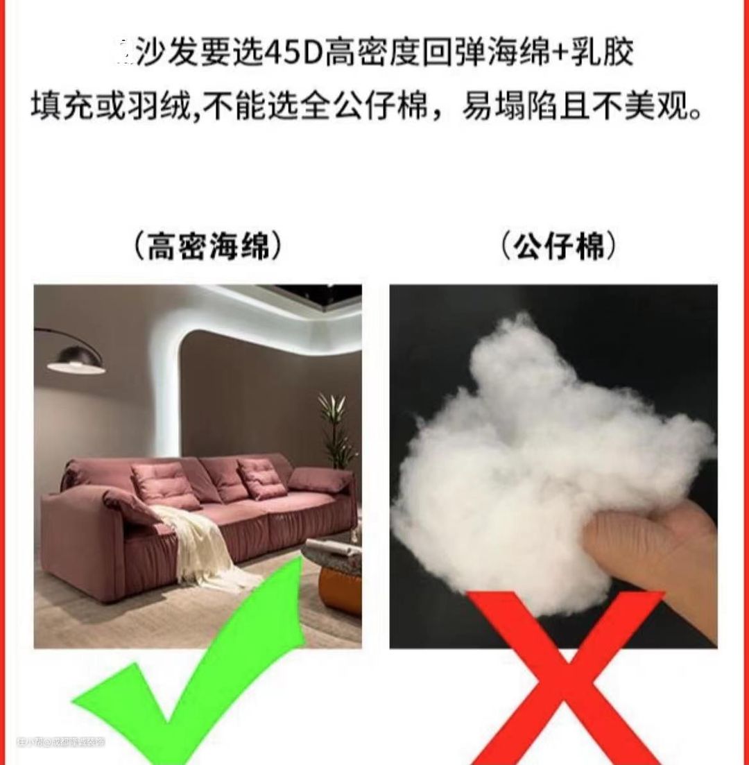 第二种:45密度以内的海绵沙发别买,商家都说高密度,直接问他海绵密度是多少,坐垫位置的海绵要是60密度的,密度正好、支撑好、容易起身,同样一个坐垫,密度越高越重,而不是密度越高越硬。
