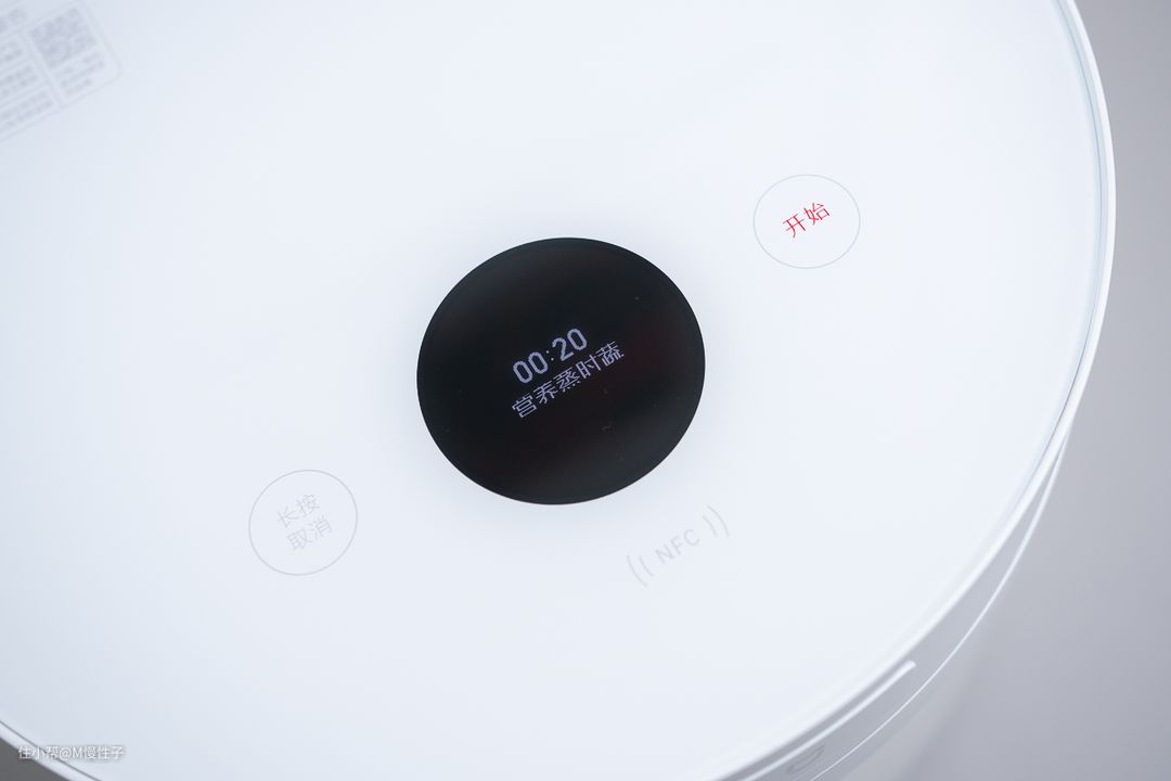 顶部是控制和显示的区域,黑底白字的显示屏文字非常地清晰,字体也足够大,左右两侧的箭头可以切换菜单,有两个触控按键可以控制开始和取消。底部的NFC感应区可以说是新品米家电器的标配了,但这次它的设计也有了创新,带NFC功能的手机触控后不仅可以快速进入米家app,也可以设置一些动作,比如触控后进入保温程序等细微的设置。并且既然是智能家电,在默认的7档菜单上,还可以在app上设置其他常用菜单,发送到这7个默认菜单上,下次直接在饭煲的默认菜单上调用。