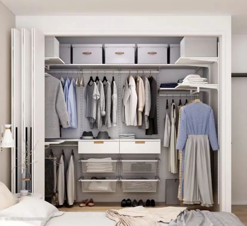 ·就近原则:衣柜可以分为高中低三个区域,高区主要存放不常用的,如换季的被子、枕头等厚重物品,底部存放鞋子、杂物或是一些不常用的衣物。而使用频率最高的衣物应该存放在中间部分的挂衣区和抽屉区,不下蹲、不踮脚也可以轻松拿取,十分便捷。