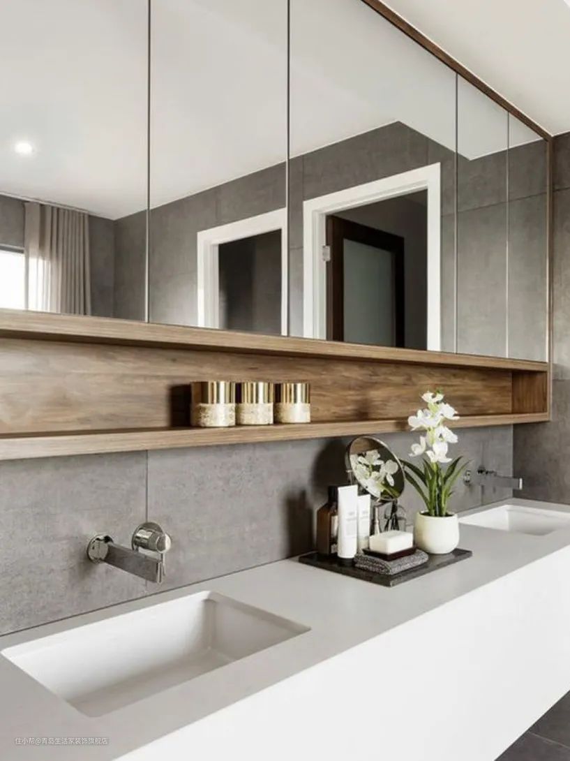 这时,镜柜的面板和内部就是很好的收纳空间,大一点的瓶瓶罐罐可以放在隔板上面,小件可以通过在面板上加装各种小型储物栏来收纳。
