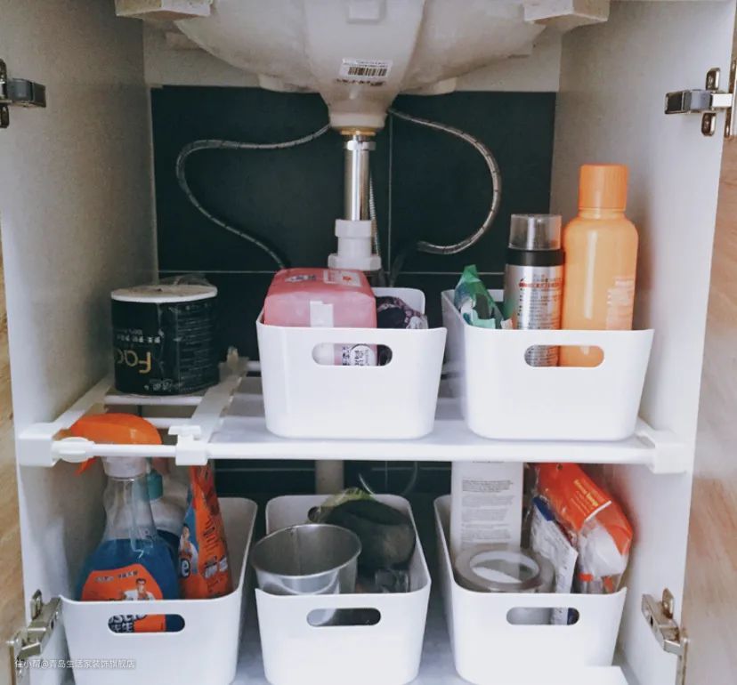 我们可以利用伸缩杆搭建一个隔板出来,既不影响下水管,也可以分出多层的储物空间。