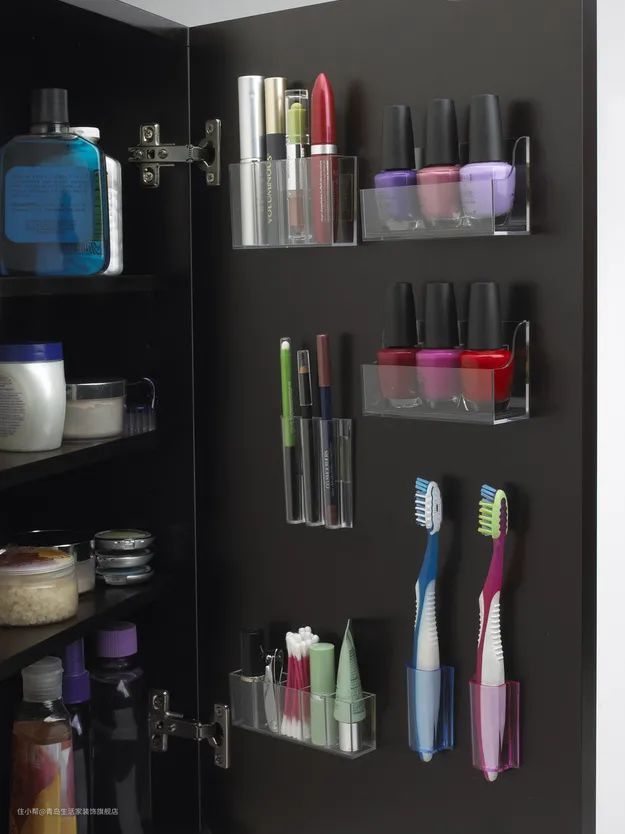 像剃须刀、眉刀这类小的金属物品,可以使用磁吸方式吸附在柜门背面,价格便宜,还比收纳夹好用。
