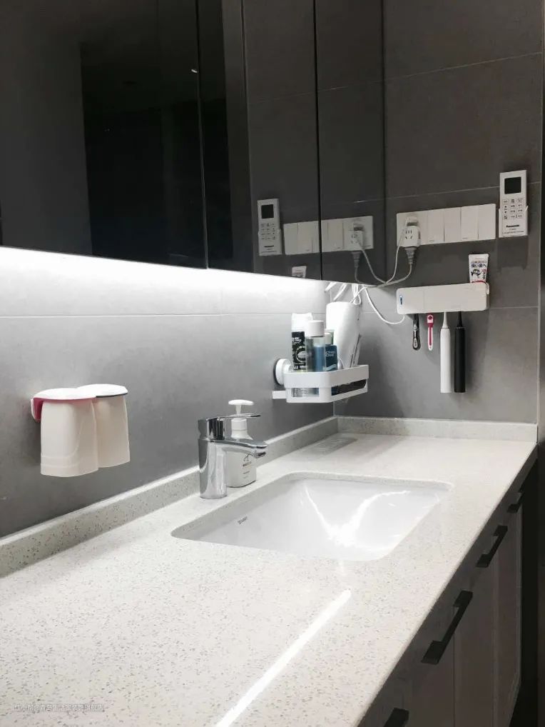 牙刷、杯子、牙膏,这些都是常用的,放台面时间久了,杯子下面容易产生水渍,牙刷放杯子里,因为潮湿,末端也容易发霉。不如让它们都“离开”台面,比如选择可杀菌的牙刷消毒器,和磁吸漱口杯贴。