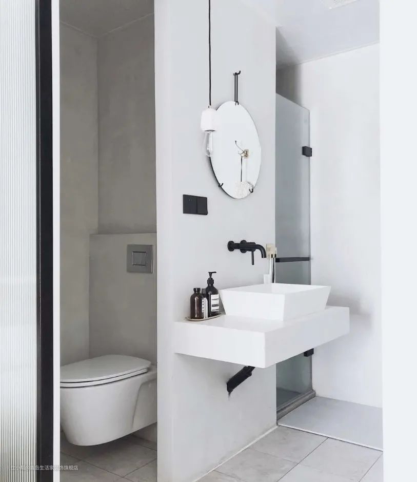 马桶作为早晚卫浴使用的交集,为了提高效率,不妨将马桶独立出去。同时,如果是马桶->出门->洗手的动线,那一切便变得十分繁琐。所以,在脱离卫浴空间后,马桶应该变得更加“独立”。