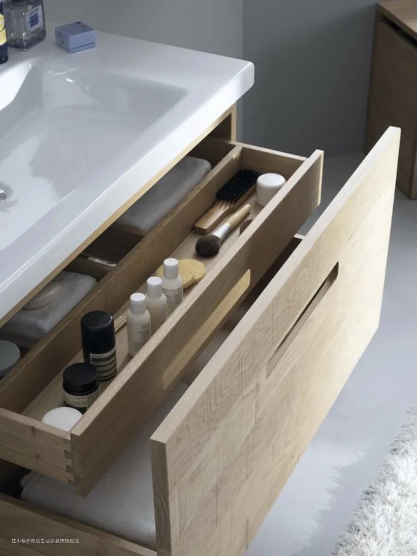推介采用墙排设计,下水管包进墙面,不会经过柜子中间,保证了浴室柜空间的最大化。而抽屉式自然是最佳选择,可以根据物品的不同属性分层存储,小件区也可搭配各式隔板使用。