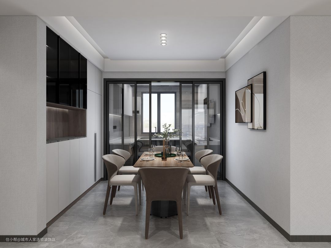 餐厅做了整体的酒柜,原木色的桌面与木色布艺餐椅和谐一致,整体的无主灯设计,使得整体餐厅别有一番韵味。