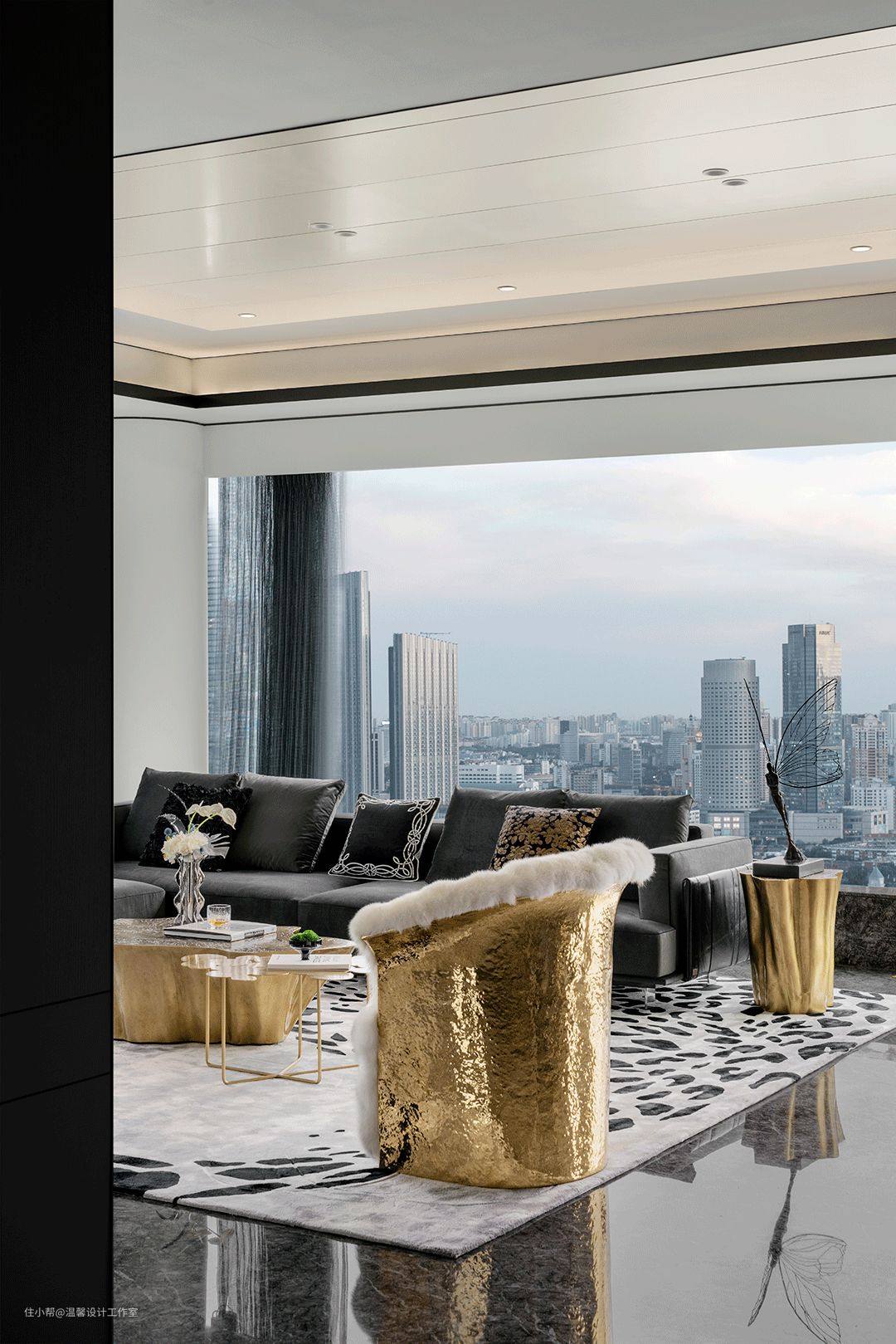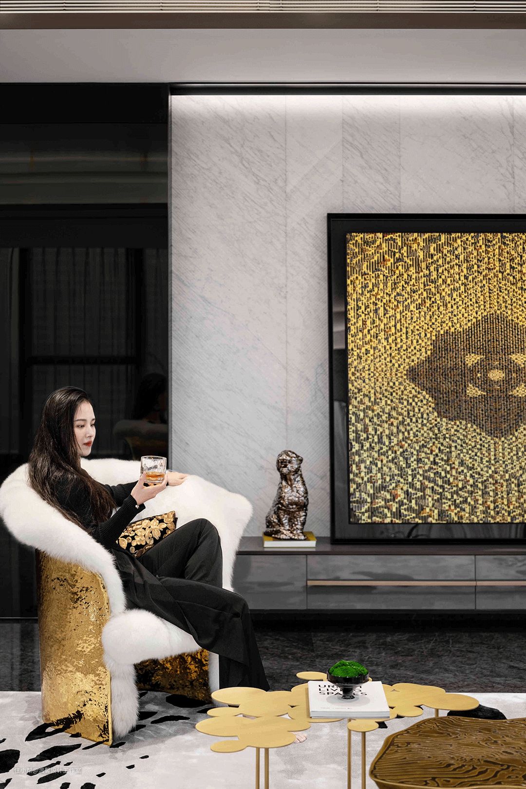 金色的单人沙发被雪白的皮毛环绕,刚与柔交错,像一个珍贵柔软的拥抱。