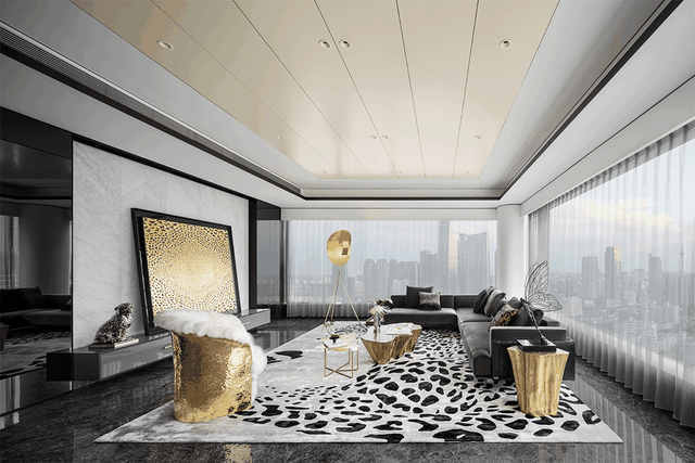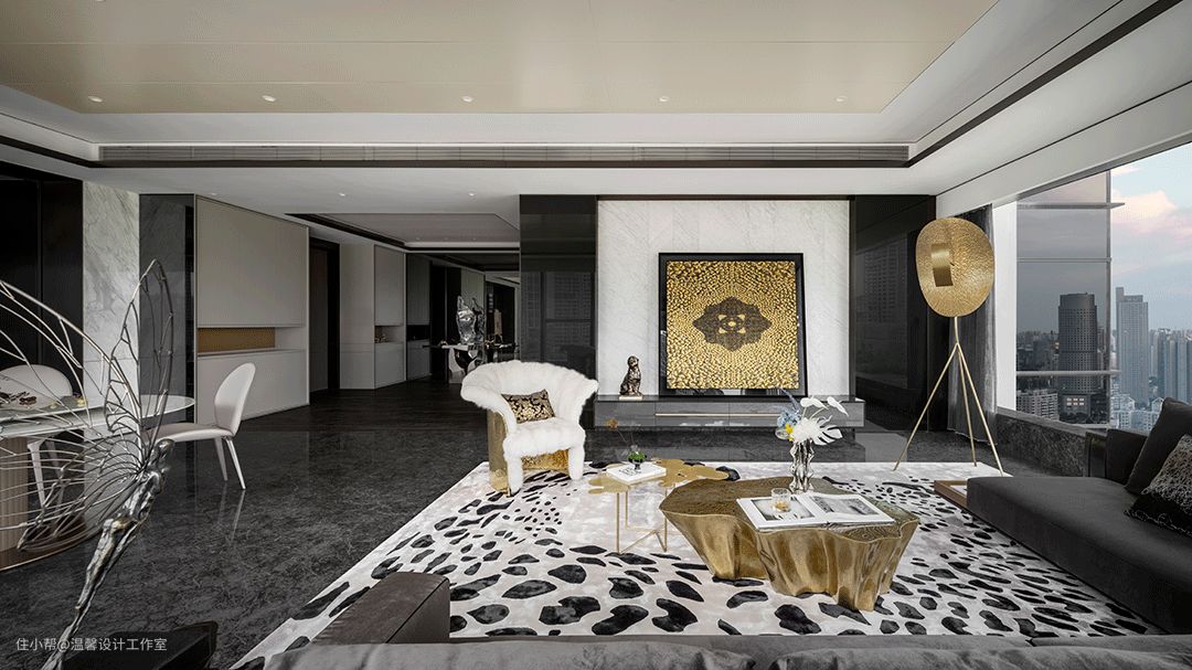 客厅空间的整体色系为黑灰色,通过不同深浅的同类色打造出空间层次,而精心搭配的金色融入其中,华而不俗,让整个空间新颖时尚吸人眼球。