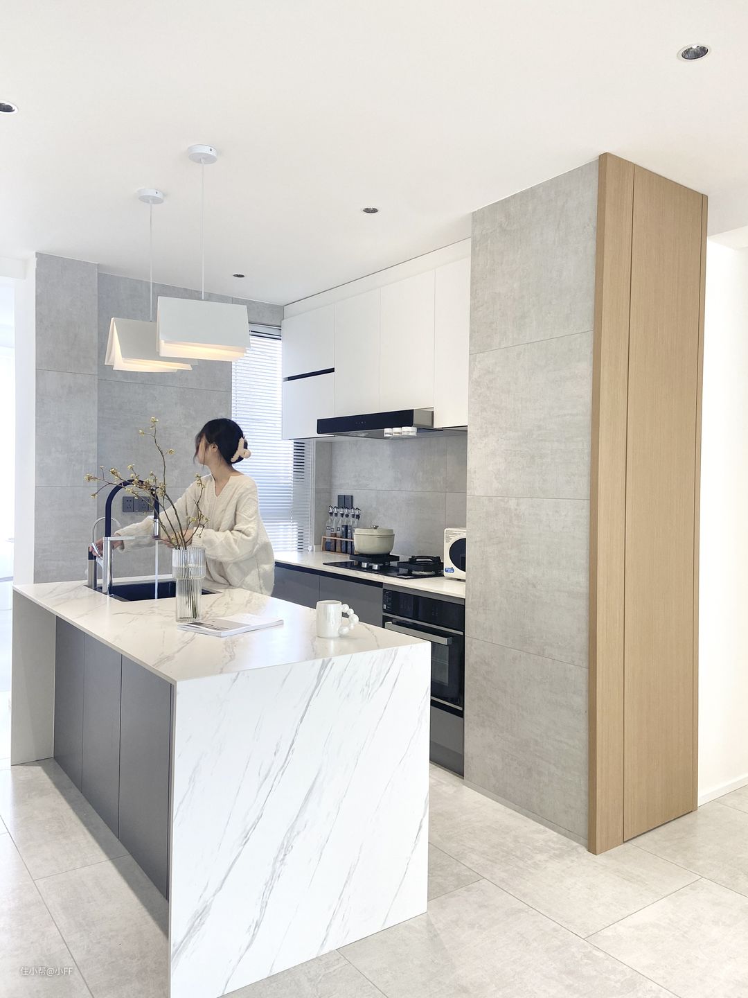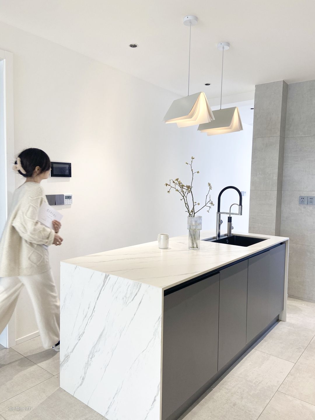 🌟橱柜是多层板,是哑光烤漆,下柜灰色,上柜白色。台下盆黑色石英石。台面是用的岩板,岩板色号爵士白。